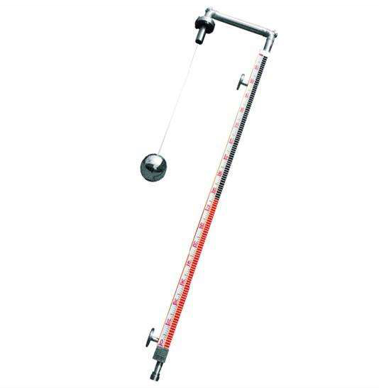 二、結構原理該產品是以浮標為測量元件,浮標隨液位的變化沿導向鋼絲繩上、下浮動,通過牽引浮標的鋼絲繩帶動容器外另一端的重錘和指針同步反向移動,指針連續指示出液位的高度。根據力平衡原理,假設當液位處于某一高度時浮標重量為W,重錘指針重量為W1,浮標浸在液體中所受到的浮力為F,系統摩擦力為f。在平衡狀態下:W-F-W1-f=0。當液位上升時,浮力F增大,W、W1和f均不變,上式平衡破壞,重錘指針下滑。直到F力減小到原來值,新的平衡才建立。如F力一直在增大,即液位一直在上升,則重錘指針一直下滑。反之,液位下降,則重錘指針上升。以此來指示液位的高度。如果選用法蘭連接式并帶磁偶合指示器的浮標液位計,不但具有液紅汽藍的雙色顯示功能,同時還可配液位變送器來連續輸出4~20mA直流信號,實現遠距離控制。